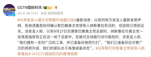 以色列军方发言人最新发表声明,拒绝透露是如何确认黎巴嫩真主党领导人纳斯鲁拉死讯的,但坚称已得到证实。该发言人称,以军9月27日空袭黎巴嫩真主党总部时,纳斯鲁拉与真主党一些高层指挥官正在这一地下总部中。在被问及地面行动可能性时,该发言人称,“我们拥有一系列广泛的工具,并已准备好使用它们”,“我们已准备好应对更广泛的局势升级,我们的部队处于高度戒备状态”。