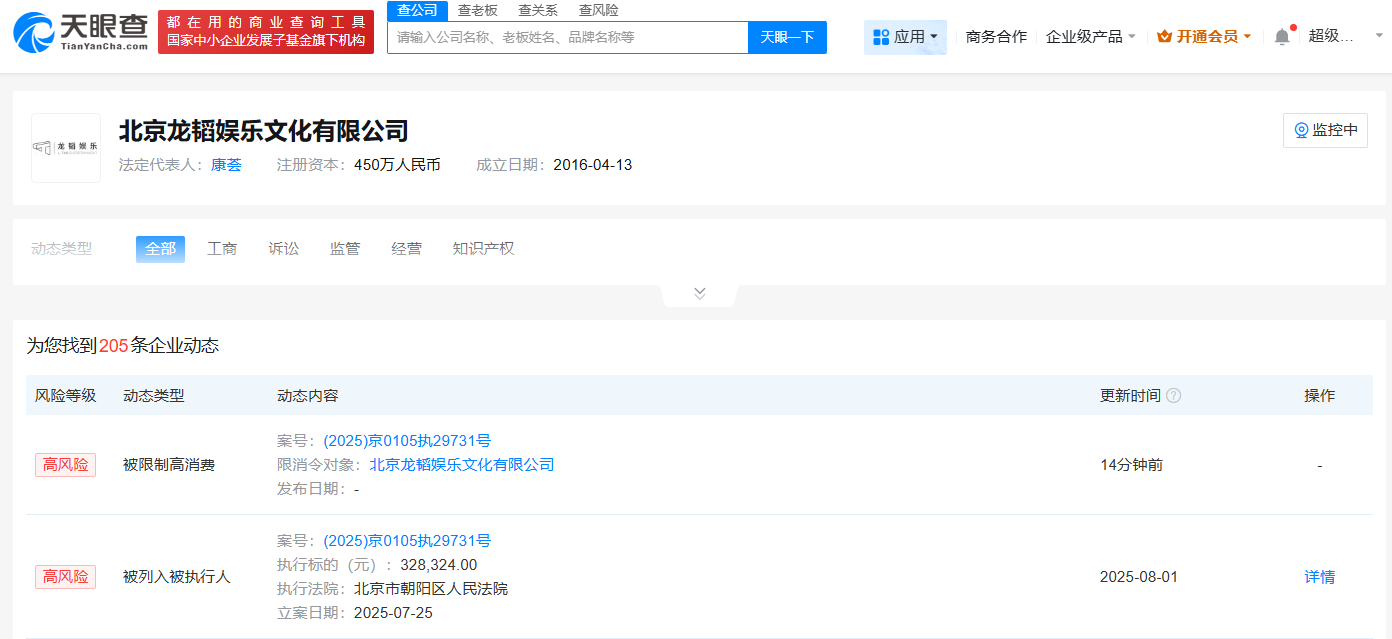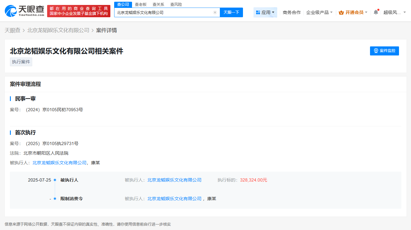 天眼查App显示,近日,北京龙韬娱乐文化有限公司因未按指定期间履行生效法律文书确定的给付义务,被北京市朝阳区人民法院限制高消费,涉及与北京史努比利文化传播有限公司相关服务合同纠纷案件。案件流程信息显示,此前,该公司已因此案被执行32万余元。