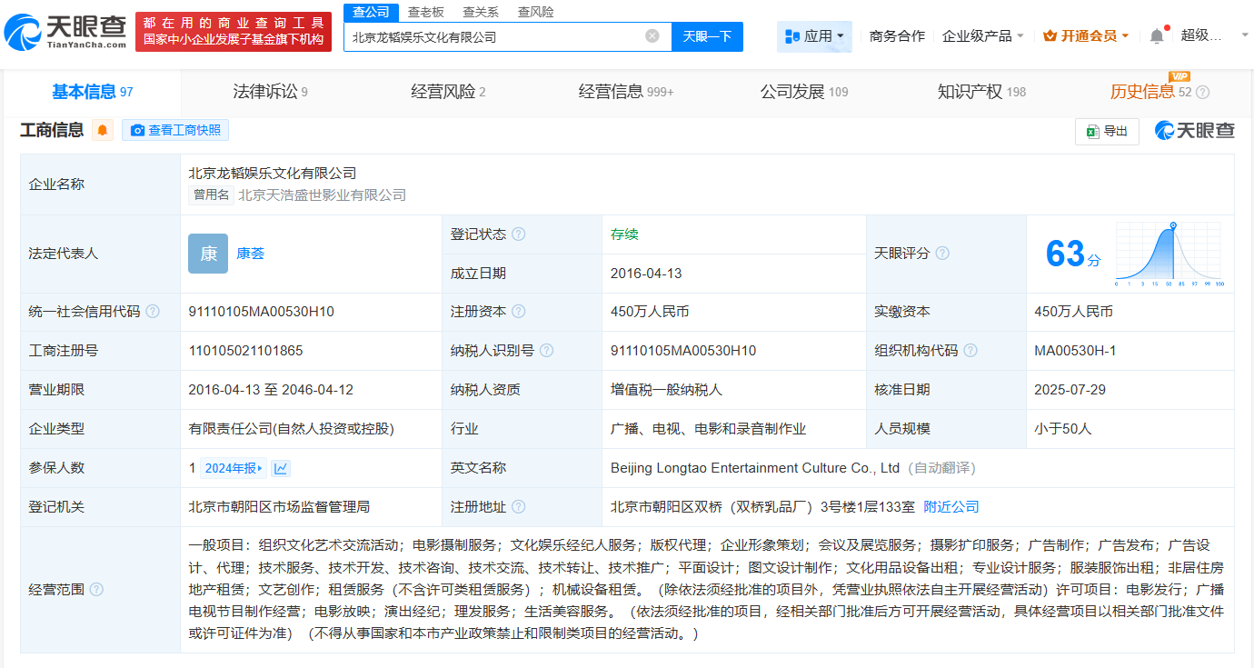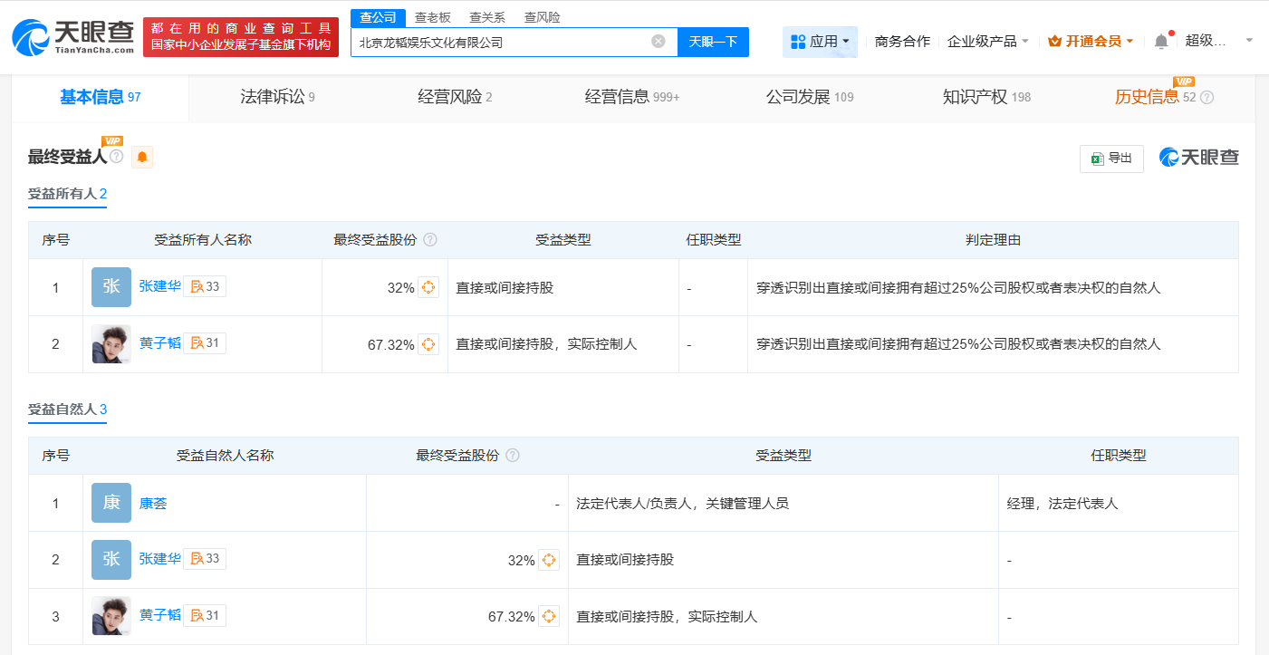 北京龙韬娱乐文化有限公司成立于2016年4月,法定代表人为康荟,注册资本450万人民币,经营范围包括文化娱乐经纪人服务、组织文化艺术交流活动、演出经纪等。最终受益人信息显示,该公司实际控制人为黄子韬。变更记录显示,近日,黄子韬刚卸任该公司执行董事。