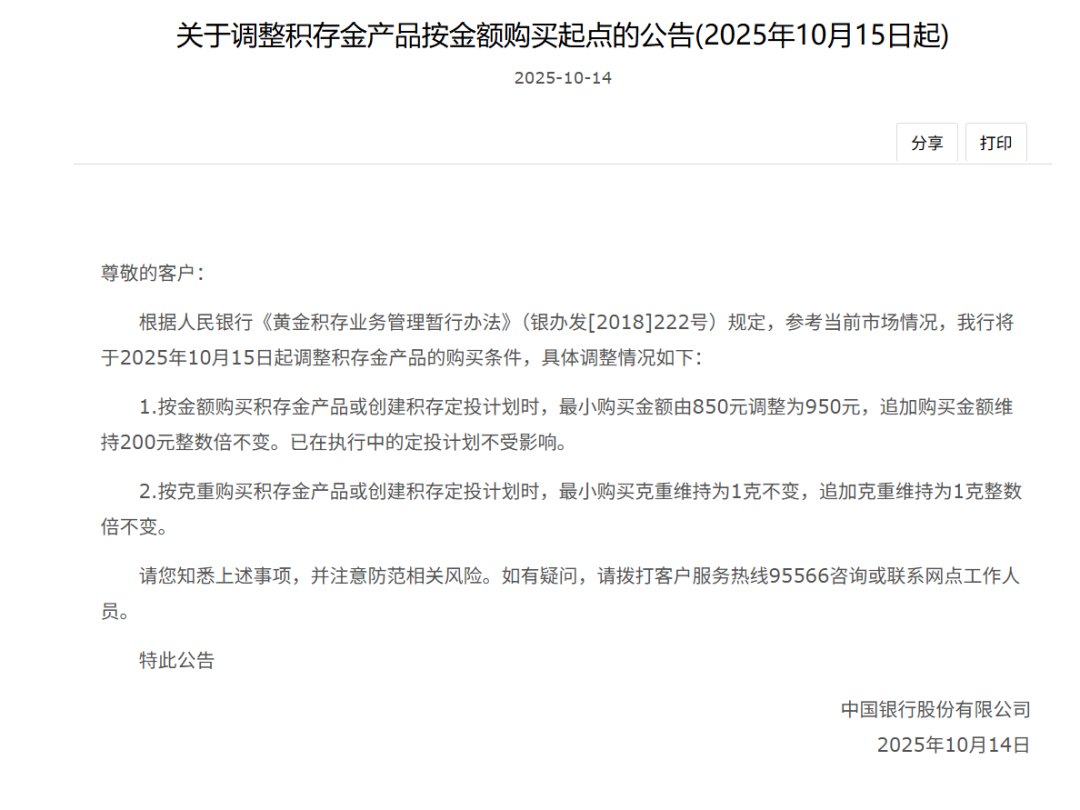 “参考当前市场情况,我行将于2025年10月15日起调整积存金产品的购买条件。”10月14日,中国银行发布了《关于调整积存金产品按金额购买起点的公告》,将该行积存金产品的最小购买金额由850元调整为950元。