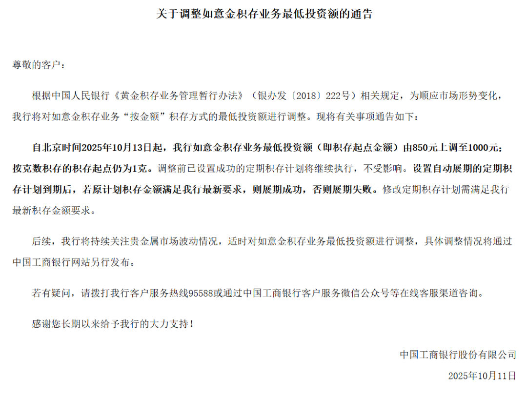 10月11日,工商银行也发布了相关公告,提高了该行积存金业务的投资门槛。公告显示,自10月13日起,该行将如意金积存业务最低投资额(即积存起点金额)由850元上调至1000元;按克数积存的积存起点仍为1克。
