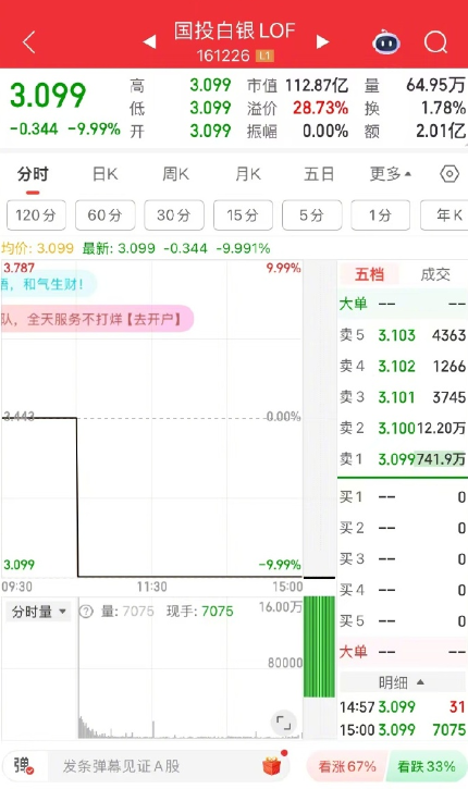 2月6日,国投白银LOF场内开盘触达跌停,最新溢价率为28.73%。国投白银LOF自2月2日复牌以来,已连续第五个交易日开盘即跌停。